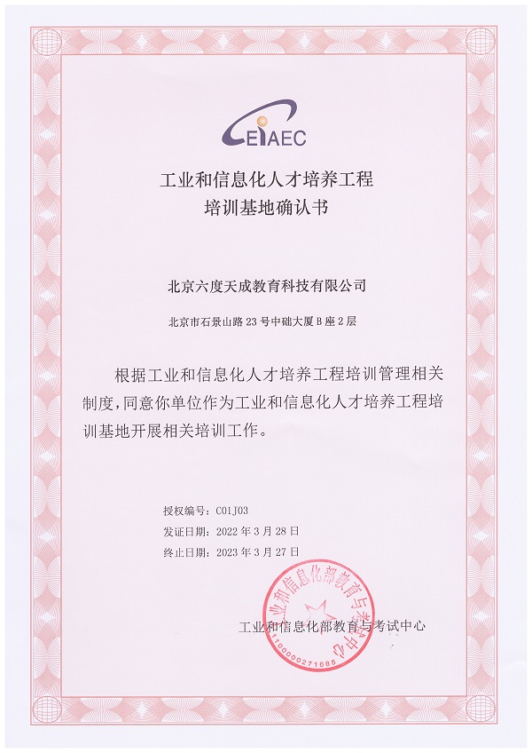 日前,北京六度天成教育科技有限公司通過2022年年度審核,獲頒2022-2023年度工業和信息化人才培養工程培訓基地確認書。 [查看詳細]