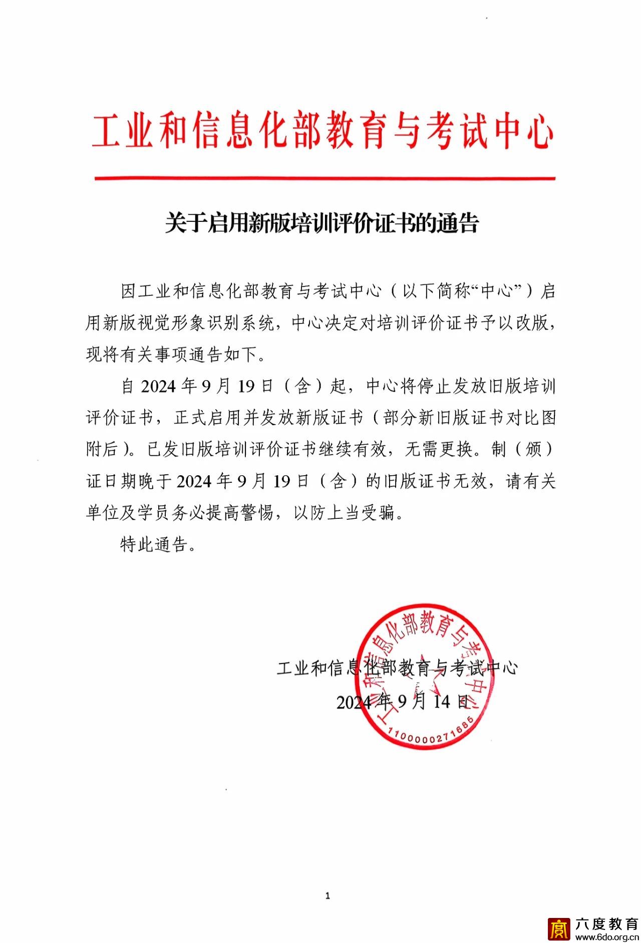 工業(yè)和信息化部教育與考試中心關(guān)于啟用新版培訓(xùn)評價(jià)證書